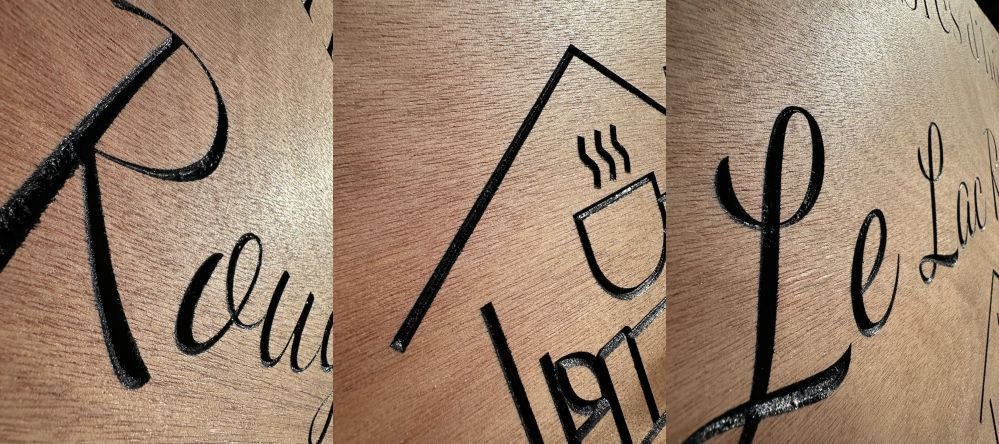 Les lettres noires, peintes dans la gravure, offrent un contraste net et lisible, assurant une parfaite visibilité du message, sans nuire à l’esthétique sobre et naturelle du bois.